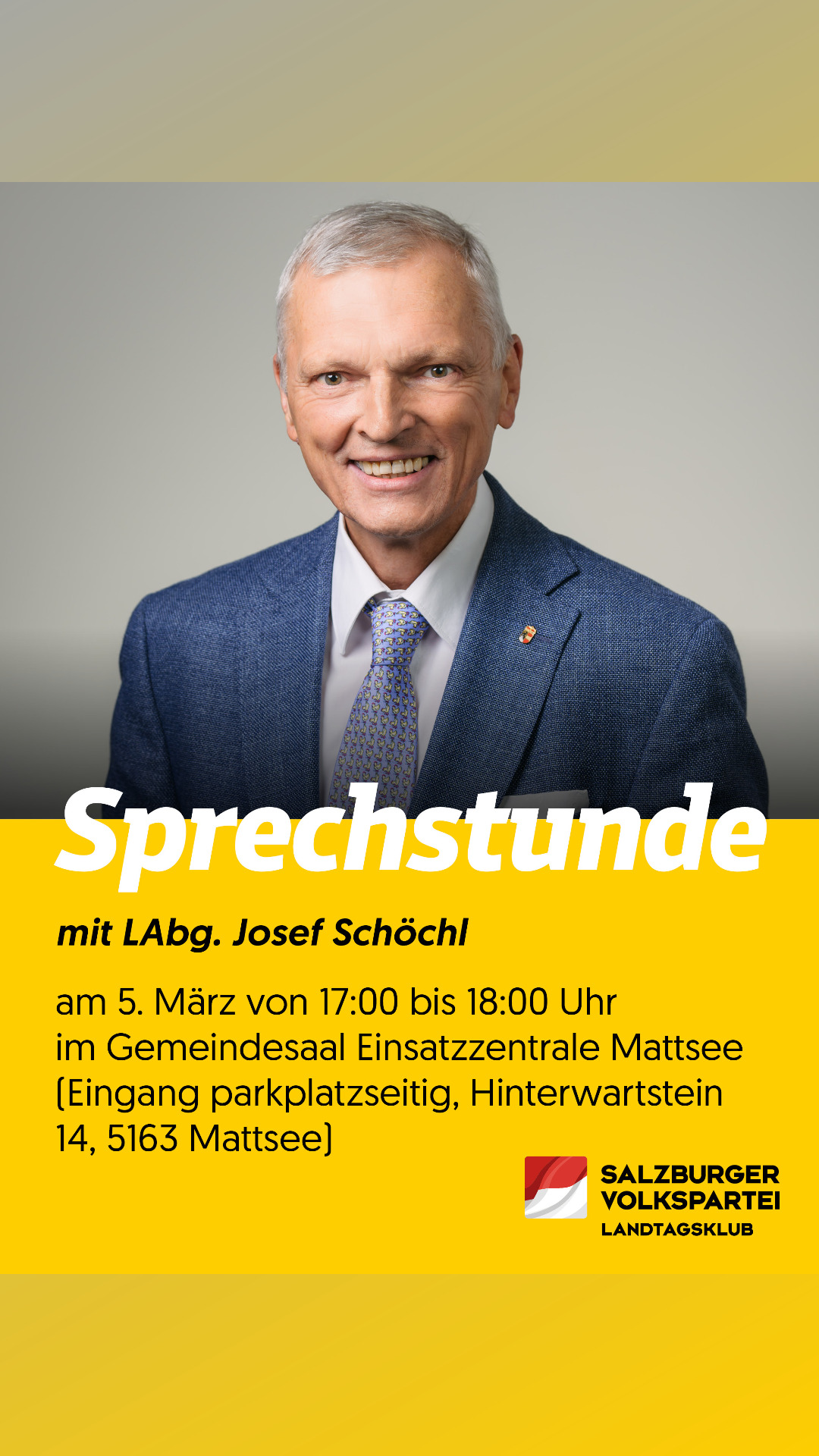Landtagsabgeordneter Pepi Schöchl ist am 5. März 2026 in Mattsee zu einer Sprechstunde zu Gast. Alle Bürgerinnen und Bürger sind herzlich eingeladen, Anliegen und Fragen mit ihm zu diskutieren und vorzubringen.